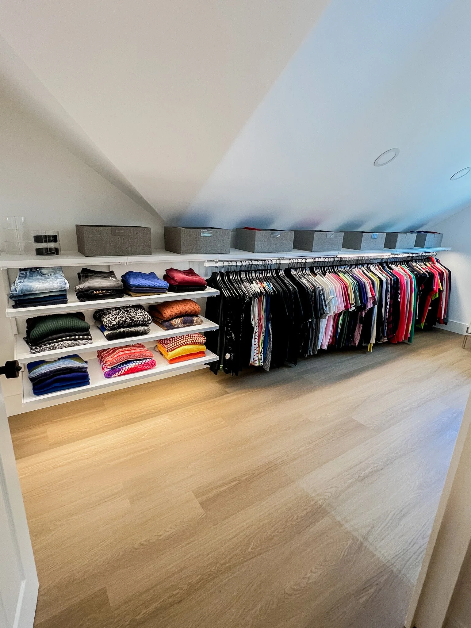 Our client moved into a beautiful new home, so we were able to create custom solutions based on their exact needs. This meant transforming this guest room into our client’s dream closet, complete with a separate shoe storage, custom lighting and vanity area. These sloped ceilings meant we had to get creative with the shelving and hanging sections.